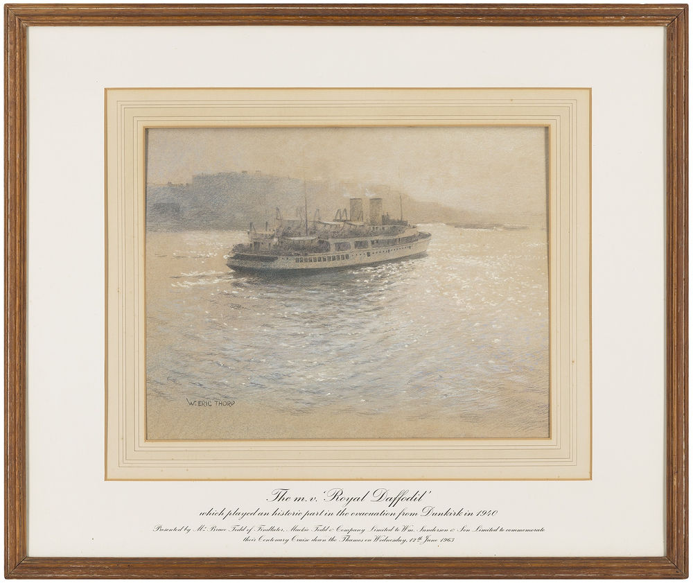 The Wapping Group of Artists as ‘Outward Bound – ‘The Royal Daffodil’.A reviewer of this exhibition stated – ‘There were, again, a few pastels. Two of these, by W. Eric Thorp ‘A late evening arrival, King George V Dock’ and (a delightful colour contrast) ‘Outward Bound – The Royal Daffodil’, were of great beauty.