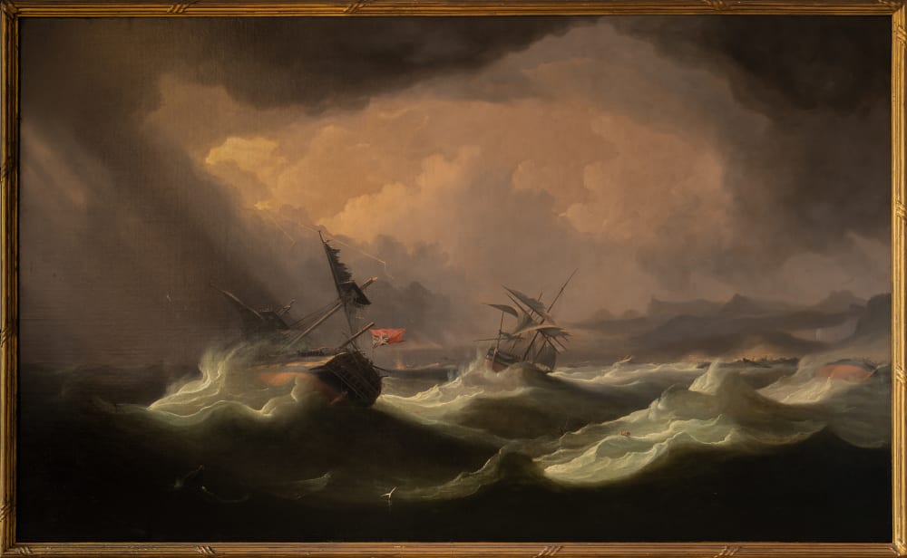 This dramatic work by Huggins, perhaps commissioned by Captain Edward Troubridge of the plucky little Harrier, depicts in graphic terms (from the left) the Blenheim on her beam ends, flying the instantly recognisable signal of distress between her stern and mizzen stump, the Java, fighting to stay afloat under torn canvas and with her topmasts gone and, seen clearly off Java’s stern, the silhouette of a small two-masted vessel under bare poles (surely the Harrier?) attempting, albeit unsuccessfully, to run into Port Mathurin for shelter on the nearby shore. Despite the overwhelming menace of sky and sea, the painting is nevertheless an accurate testament to the last confirmed sighting of Sir Thomas Troubridge’s doomed squadron and thereby laying the mystery to rest.
